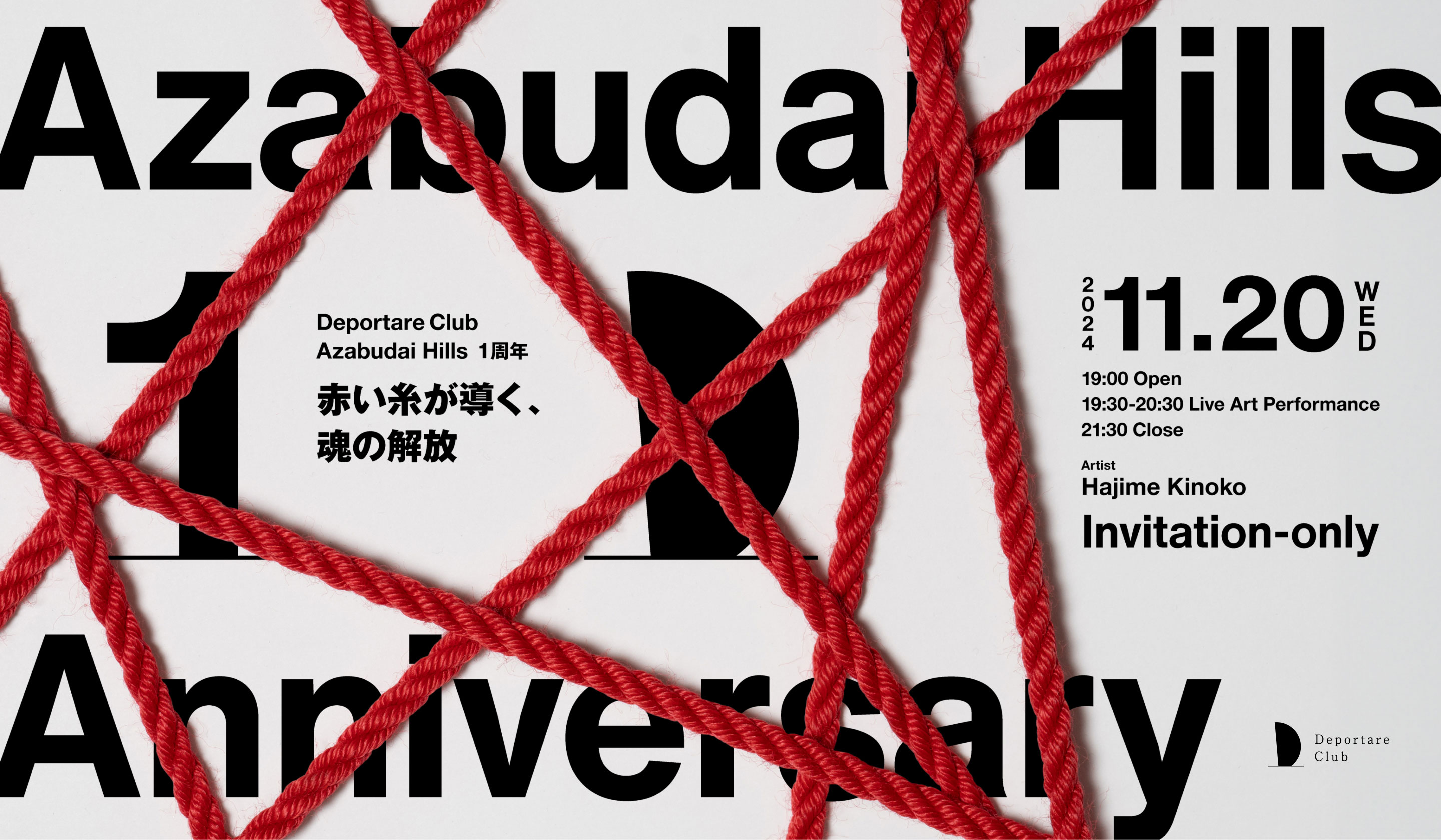 2023年11月に麻布台ヒルズに拡大移転してから早1年。この秋、Deportare Clubは西麻布時代からこれまでに関わっていただいたすべてのお客様をお招きして、「赤い糸が導く、魂の解放」と題した一夜限りのスペシャルイベントを行う。舞台となるのは麻布台Deportare Club。主役は世界から注目を集めるロープアーティストHajime Kinoko氏と、賓客である皆さま。誕生以来、進化を重ねてきた私たちと共に、史上初となるトレーニング空間における緊縛ライブアートパフォーマンスの異空間をご堪能いただく。